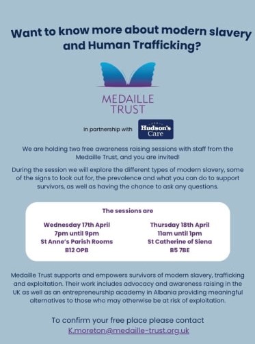 Human Trafficking Awareness sessions hosted by the Medaille Trust, in partnership with Father Hudson’s Care, will take place from 7pm until 9pm on Wednesday (17 April) at St Anne’s Parish Rooms, Digbeth B12 OPB, and from 11am until 1pm on Thursday (18 April) at St Catherine of Siena, Bristol Street B5 7BE. The sessions will explore the different types of modern slavery, signs to look out for and what you can do to support survivors. Entrance is free, but attendees are requested to e-mail K.moreton@medaille-trust.org.uk in advance.