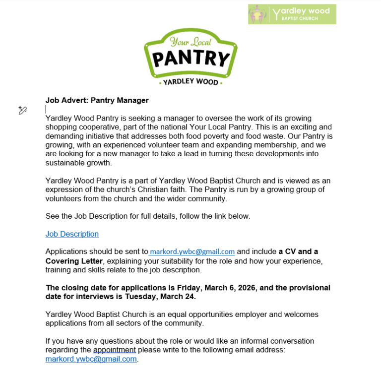Yardley Wood Baptist Church is seeking a Pantry Manager for their Local Pantry.