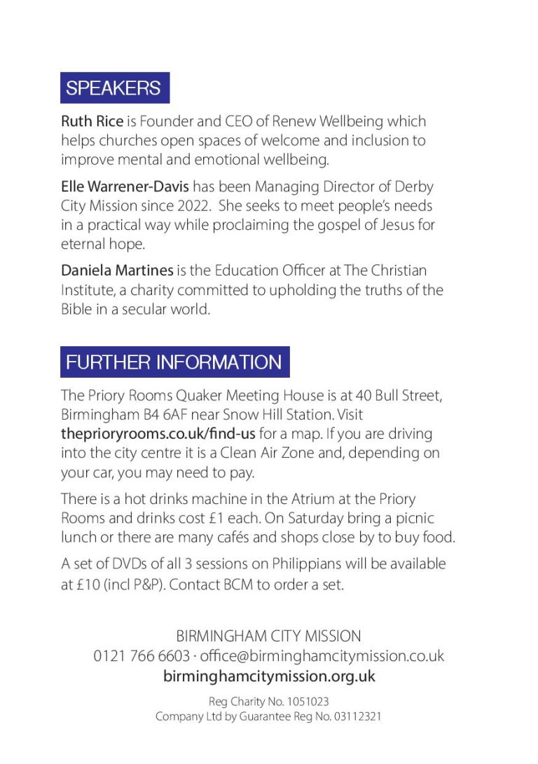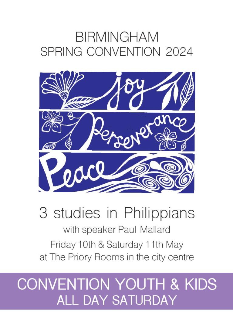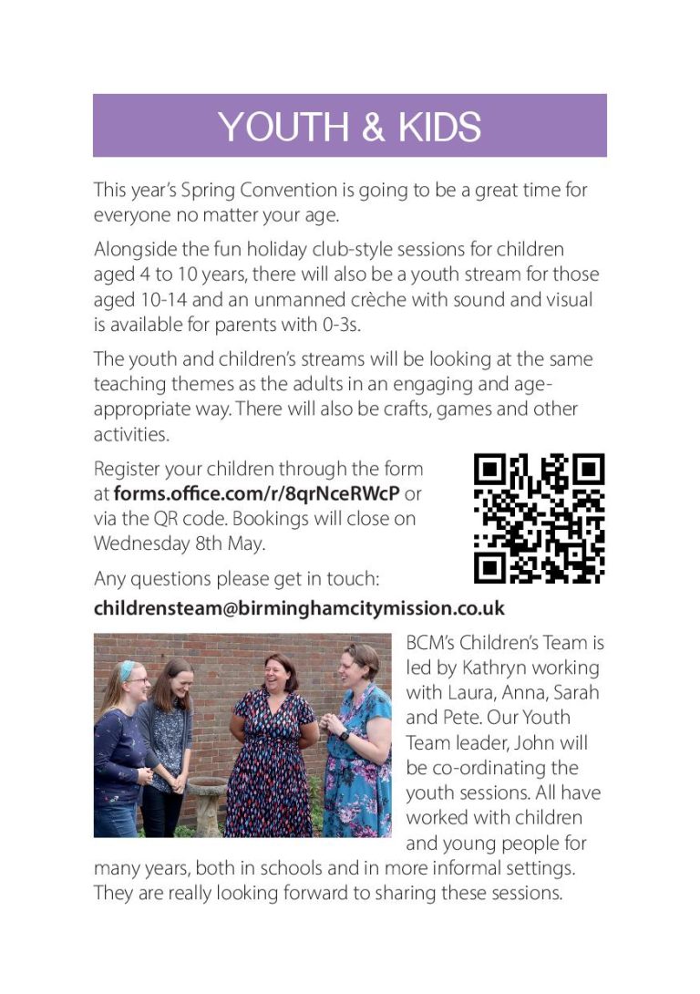 On the 10th and 11th May Birmingham City Mission will hold their Spring Convention based on 3 studies in Philippians from Paul Mallard and seminars on topics from mental health to education. Plus Convention Kids & Youth all day Saturday.