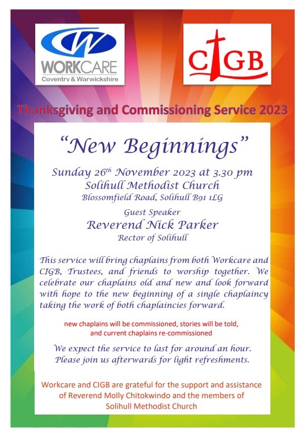 Trustees and chaplains from CIGB will be joined on this occasion by friends from ‘Coventry and Warwickshire Workcare’ ahead of the planned merger of the two organisations into a new West Midlands Chaplaincy CIO in January 2024.