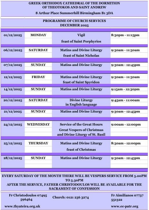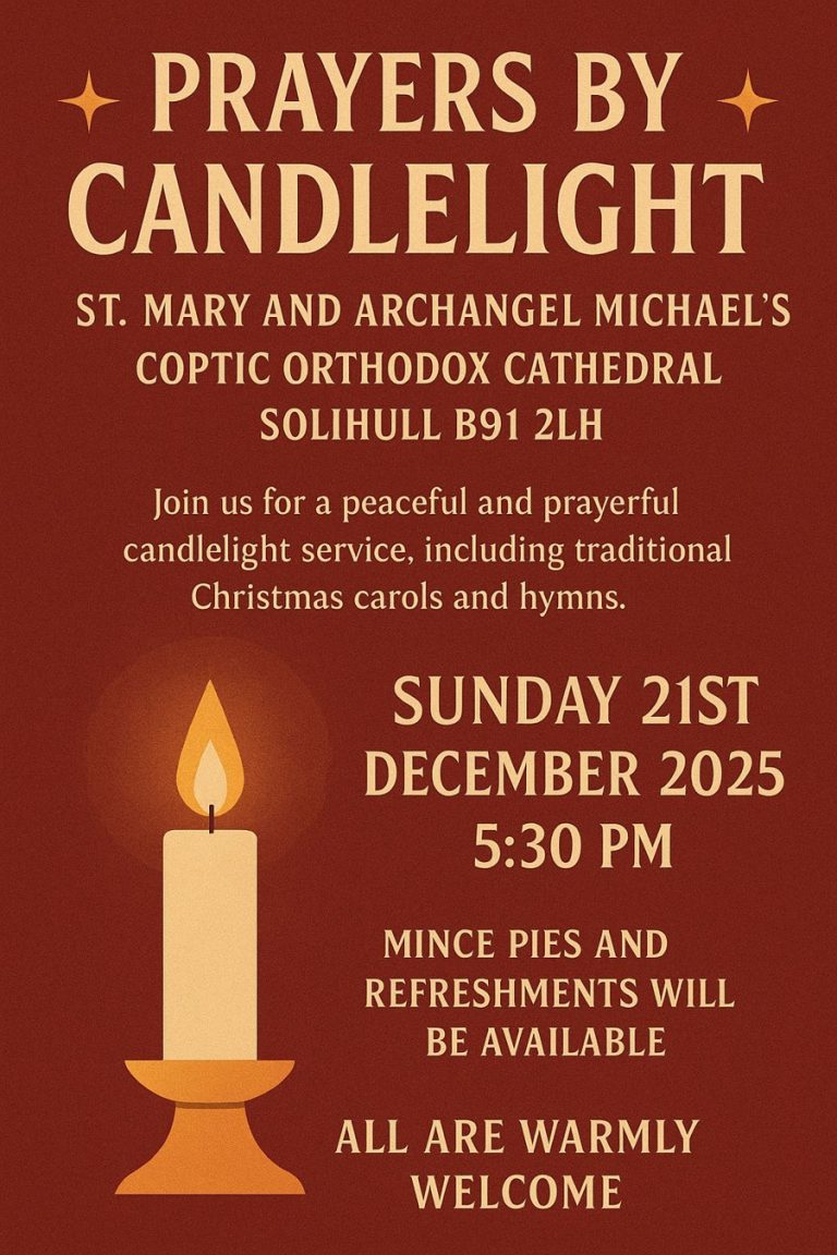 All are invited to an evening of traditional Christmas carols and prayers by candlelight! at St Mary and Archangel Michael Coptic Orthodox Cathedral, Caldwell Grove, Solihull B91 2LH, at 5.30pm on Sunday (21 December). Register attendance via https://tinyurl.com/PRAYERSBYCANDLE.