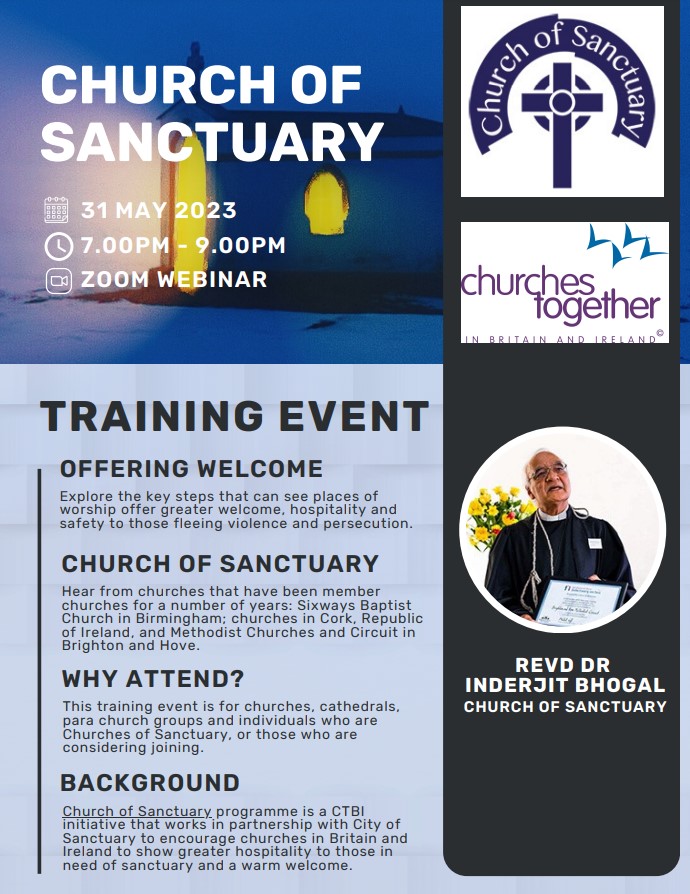 A ‘Church of Sanctuary’ training event will take place from 7.00pm to 9.00pm on Wednesday 31 May via Zoom.