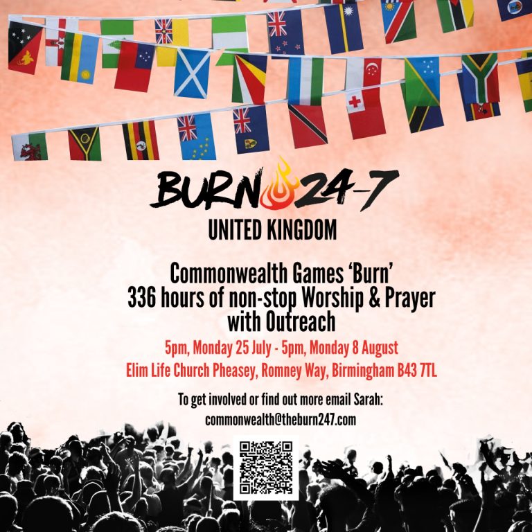 An online, international ‘Healing the Commonwealth’ prayer gathering took place on Monday 27 June. A ‘Blessing the Commonwealth’ meeting took place at Gas Street Church on Saturday 16 July, the service being relayed around the world via YouTube. On Sunday 24 July, just prior to the start of the Games, an ecumenical, civic ‘Service of Praise’ was held at St Chad’s Cathedral. The Lord Lieutenant of the West Midlands, the High Sheriff of the West Midlands and the Lord Mayor of Birmingham joined senior leaders from a number of the city’s Churches in welcoming the Commonwealth Games to the midlands (Report HERE). From Monday 25 July until Monday 8 August, 336 hours of unbroken worship and prayer were undertaken at the Elim Life Church building in Pheasey (kindly loaned), with the help of friends from around the country belonging to the ‘Burn 24/7’ network and the participation of local intercessors. Through these combined activities, the 2022 Commonwealth Games was soaked in prayer.