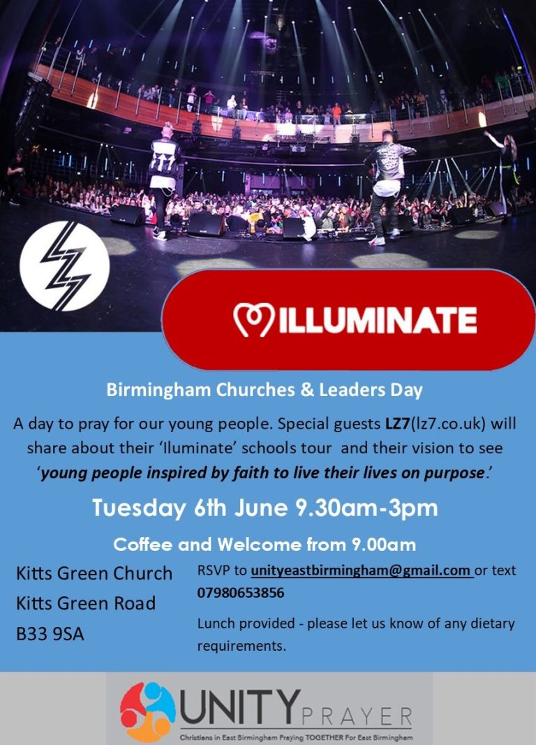 The ‘Unity Prayer: East Birmingham’ network is organising a gathering of church and Christian ministry leaders from 9.00am to 3.00pm on Tuesday 6 June at Kitts Green Church, Kitts Green Road, Birmingham B33 9SA. Leaders attending will be joined by three special guests. Pastor Jonathan Oleyede, founder of The National Day of Prayer and Worship, will share what he believes the Holy Spirit is saying to the churches in Birmingham. Lee Matthews and Linz West from Christian dance music group LZ7 will share the vision to run an ‘Illuminate’ Schools Week in Birmingham in 2024. A light lunch will be provided.