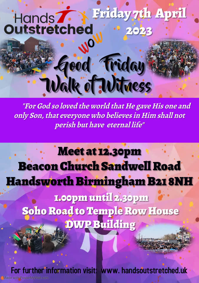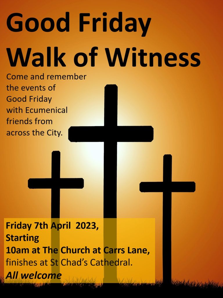 On Good Friday (7 April), the Love Walsall network is organising a March of Witness for Walsall’s churches. The event will begin at 10.00am in Park Street, Walsall. The procession will start at 10.30am from outside the Poundland store.