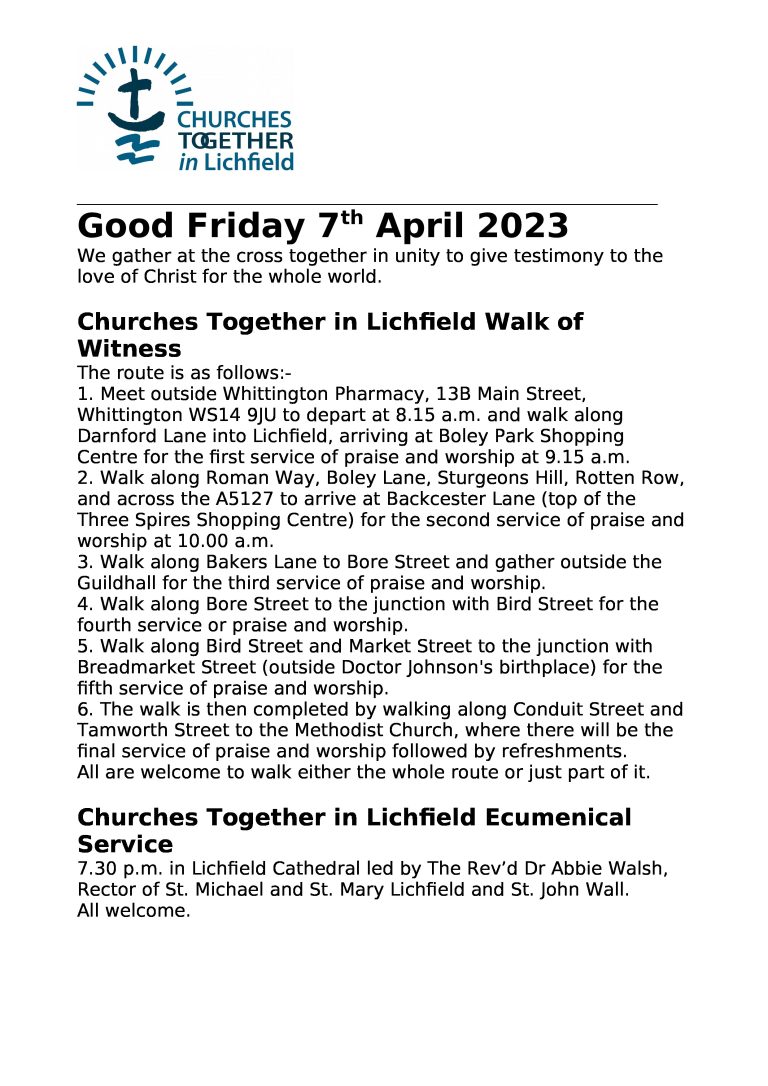 Friday 7th April Good Friday 10am—11.30am Churches Together Walk of Witness, starting outside the Co-op on Erdington High Street and finishing at St Barnabas Church.