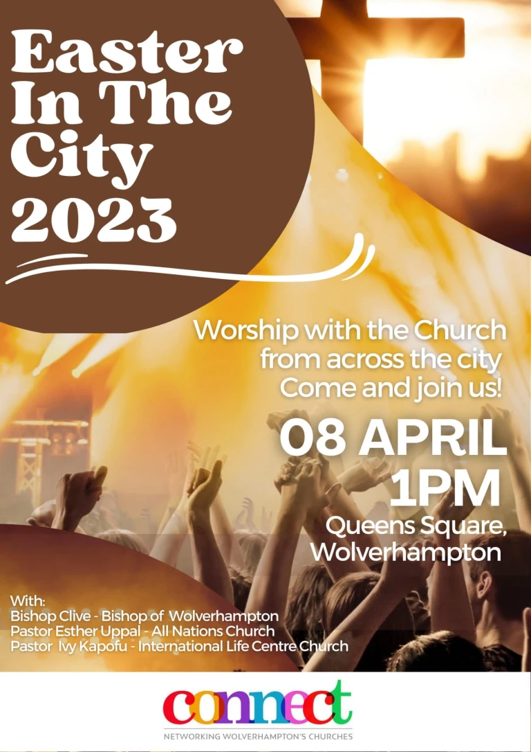 At 1.00pm on Holy Saturday (8 April), the Wolverhampton Connect network will hold an ‘Easter in the City‘ event in Queen’s Square, Wolverhampton. The special guests will be the Right Revd Clive Gregory (Bishop of Wolverhampton), Pastor Esther Uppal (All Nations Church) and Pastor Ivy Kapofu (International Life Centre).