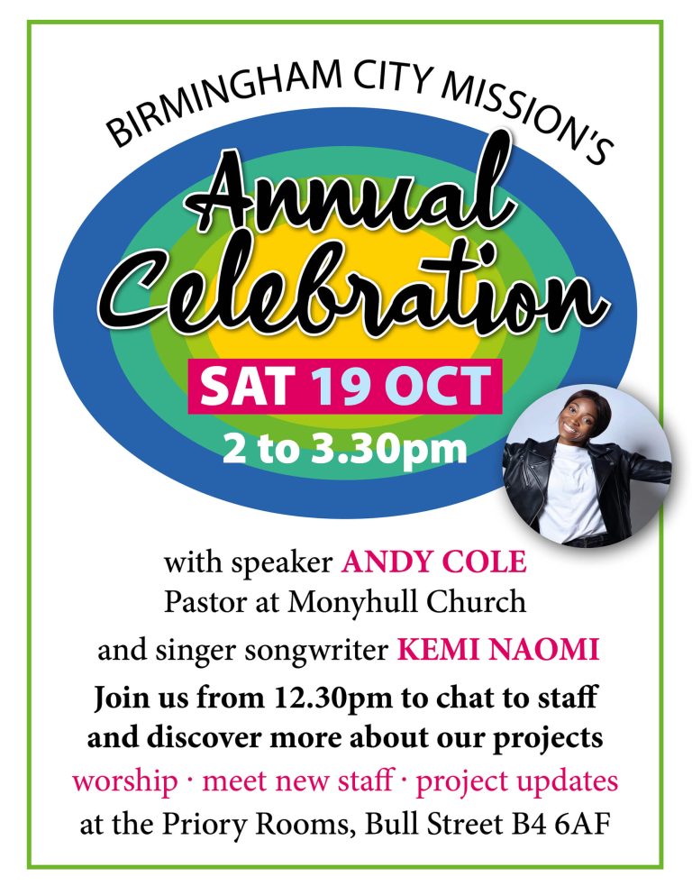 Birmingham City Mission Annual Celebration Birmingham City Mission + Add to Google Calendar + iCal / Outlook export Tags: BCM, BCT, birmingham, Birmingham Churches Together, Birmingham City Mission, Christian Unity, Christian Witness, churches together, Kemi Naomi, Pastor Andy Cole Date Oct 19 2024 Expired! Time 2:00 pm - 3:30 pm Category Mission & Evangelism Share this event