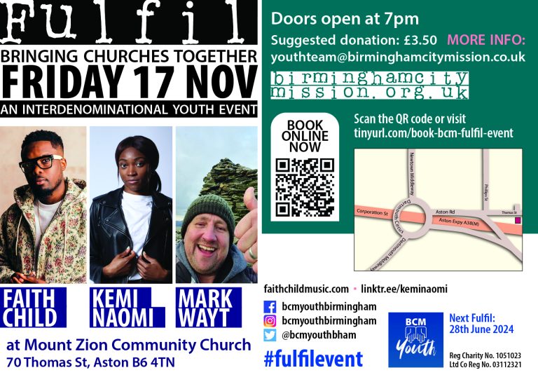 https://www.birminghamcitymission.org.uk/news/fulfil-youth-event We encourage group leaders to book in advance via https://tinyurl.com/book-bcm-fulfil-event