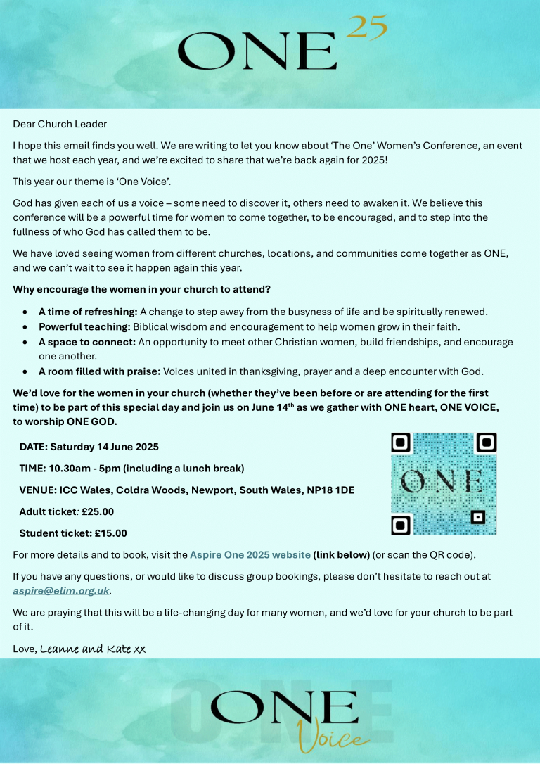 One Voice; Womens Conference + Add to Google Calendar + iCal / Outlook export Tags: One Voice, One Voice Womens Conference Date Jun 14 2025 Expired! Time All Day Category Mission & Evangelism Share this event