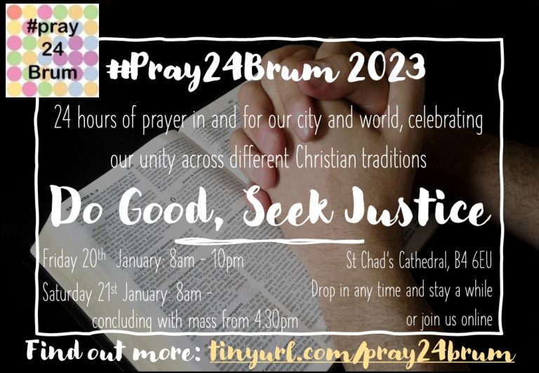 Pray 24 Brum + Add to Google Calendar + iCal / Outlook export Tags: #pray24brum, Birmingham Churches Together, churches together, Churches Together in Solihull, Pray 24 Brum, Week of Prayer for Christian Unity, WPCU Date Jan 20 - 21 2023 Expired! Time All Day Category Prayer Share this event