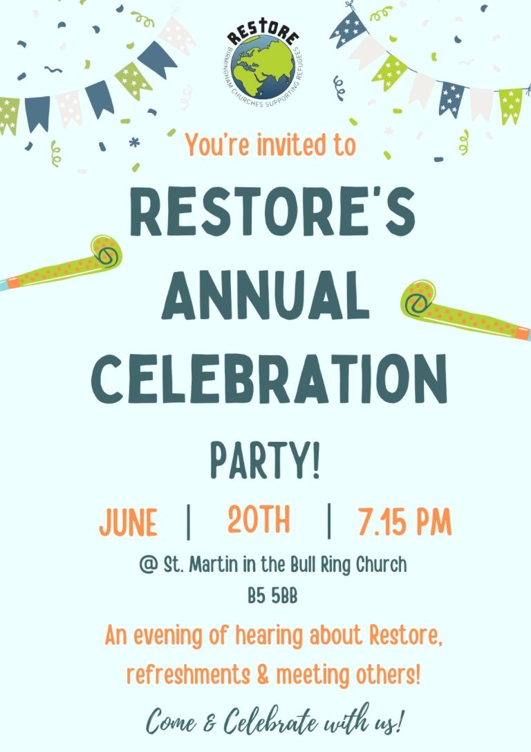 Restore: Annual Celebration + Add to Google Calendar + iCal / Outlook export Tags: Birmingham Churches Together, Restore, Restore Annual Celebration Date Jun 20 2025 Expired! Time 7:15 pm Category Social Justice Standing in the gaps Share this event