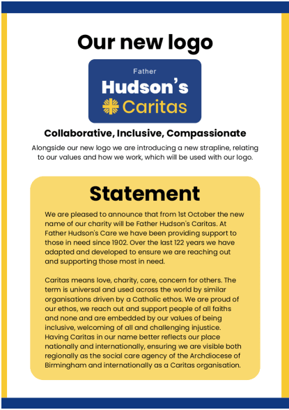 Father Hudson’s Care CEO Jo Watters said, ‘The formal link with Caritas better reflects the work we do and we look forward to working closely with parishes in the coming months.’ Along with the new name, Father Hudson’s Caritas has developed the new strapline, ‘Collaborative, Inclusive, Compassionate.’