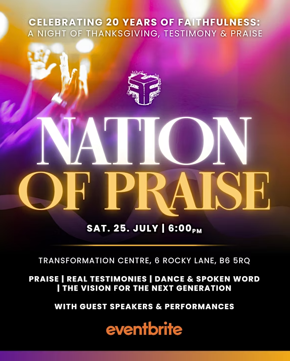 A Night of Thanksgiving, Testimony & Praise will take place at The Transformation Centre, 6 Rocky Lane, Aston B6 5RQ (home of the New Jerusalem Community Church) on Friday 25 July to celebrate 20 years of God’s faithfulness to/through the First Class Foundation.