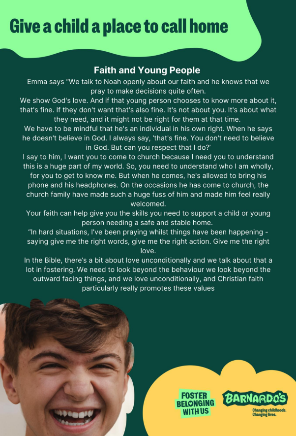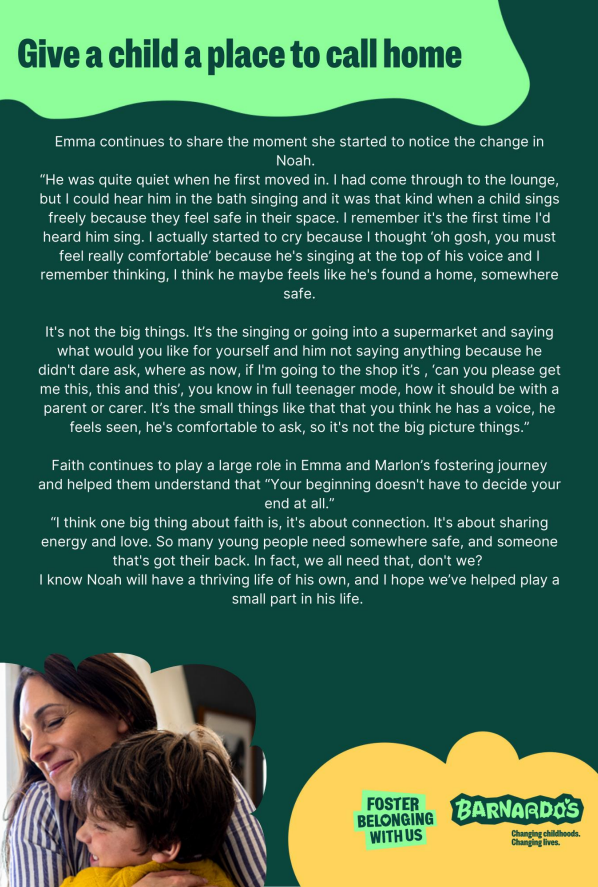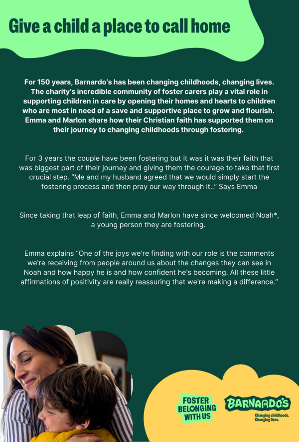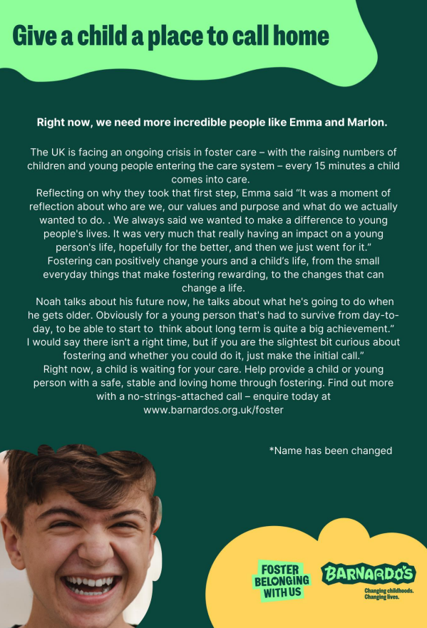 Barnardo’s is looking for foster carers to open their hearts and homes to children in need of a safe and supportive place in which to grow and flourish. For more information, visit www.barnardos.org.uk/foster.