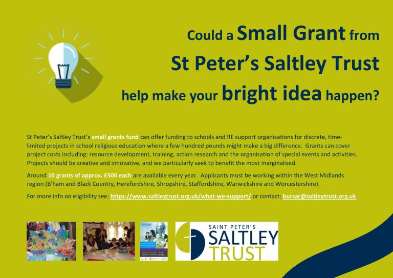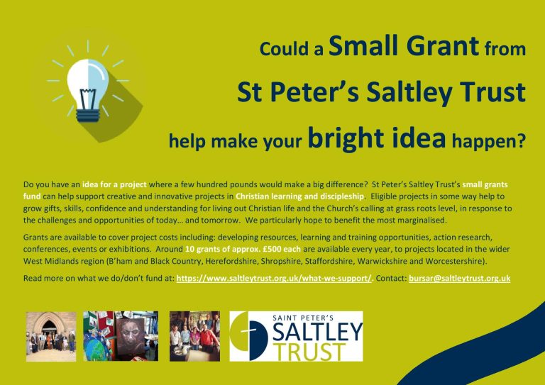 St Peter’s Saltley Trust funds and supports creative projects in three main areas: 1) school religious education; 2) faith and the further education sector; 3) Christian learning, discipleship and theological education. Each year, the Trust’s small grants fund offers around ten grants of approximately £500 each for one-off, time-limited projects in any of the three areas of work listed above. This might, for example, help to cover the costs of running a conference, exhibition or event, developing a set of learning resources, developing training, or undertaking some action research.