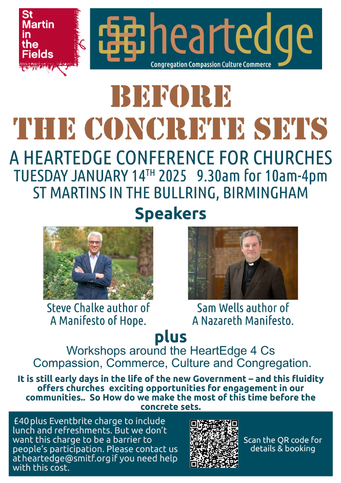 A HeartEdge Conference entitled ‘Before the concrete sets’ will take place at St Martin in the Bullring, Edgbaston Street, Birmingham B5 5BB, on Tuesday 14 January 2025, from 10.00am to 4.00pm. The conference, which is being headlined by Sam Wells and Steve Chalke, provides an opportunity to consider how we might bring a vision of hope to the communities in which we serve.