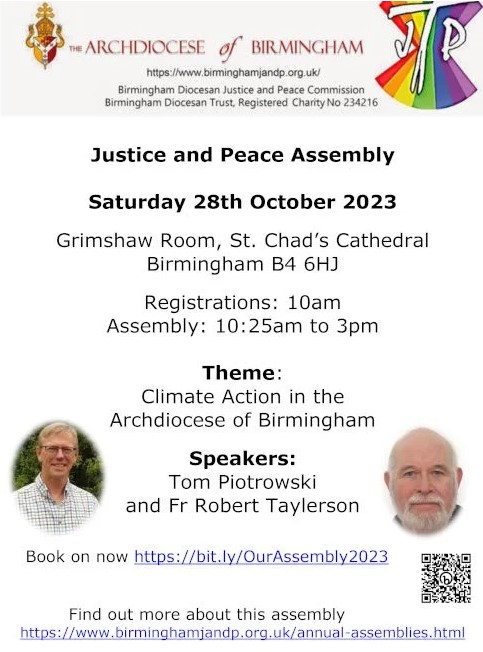 The Annual Assembly of the Birmingham Diocesan Justice and Peace Commission will take place in the Grimshaw Room, St Chad’s Cathedral, 3540 St Chads Queensway, Birmingham B4 6HJ, on Saturday 28 October, from 10.00am to 3.00pm.