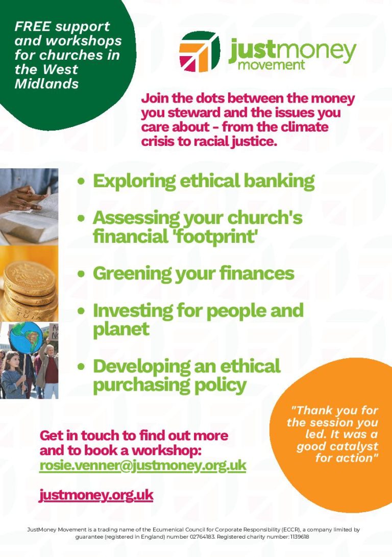 JustMoney Movement is offering free support, training and workshops to churches in the West Midlands, equipping you to connect your faith and your finances for a fairer, greener world.