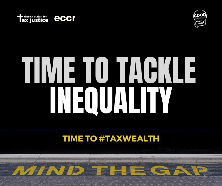 Our Church Action for Tax Justice programme (www.eccr.org.uk/church-action-for-tax-justice) mobilises Christians and churches to campaign for a fairer, more transparent tax system, where taxes are set to reflect the common good, and individuals and corporations pay their fair share. Our current Good Measure campaign calls for the Government to introduce a wealth