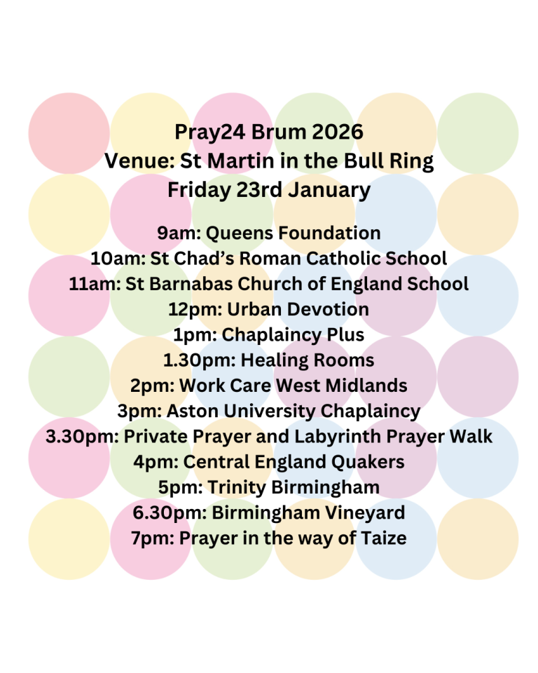 Pray24Brum is an opportunity to begin the New Year praying together with other Christians for our city. Pray24Brum will next take place on the 23rd and 24th January 2026 and will be hosted by St Martin in the Bull Ring. We hope you will join us in prayer, come when you can, leave when you must.