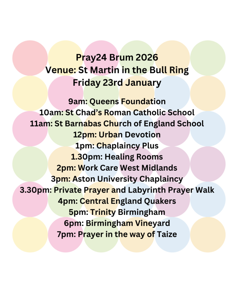 Pray24Brum begins this morning, finishing this evening at 8pm and beginning again tomorrow, 24th January at 9am. We are at St Martin in the Bull Ring and we hope you will join us in prayer.