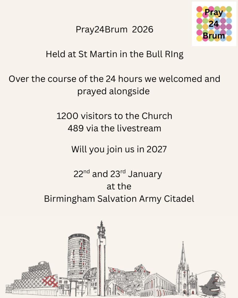 Pray24Brum is an opportunity to begin the New Year praying together with other Christians for our city. Pray24Brum will next take place on the 22nd and 23rd January 2027 and will be hosted by Birmingham Salvation Army Citadel. We hope you will join us in prayer, come when you can, leave when you must.