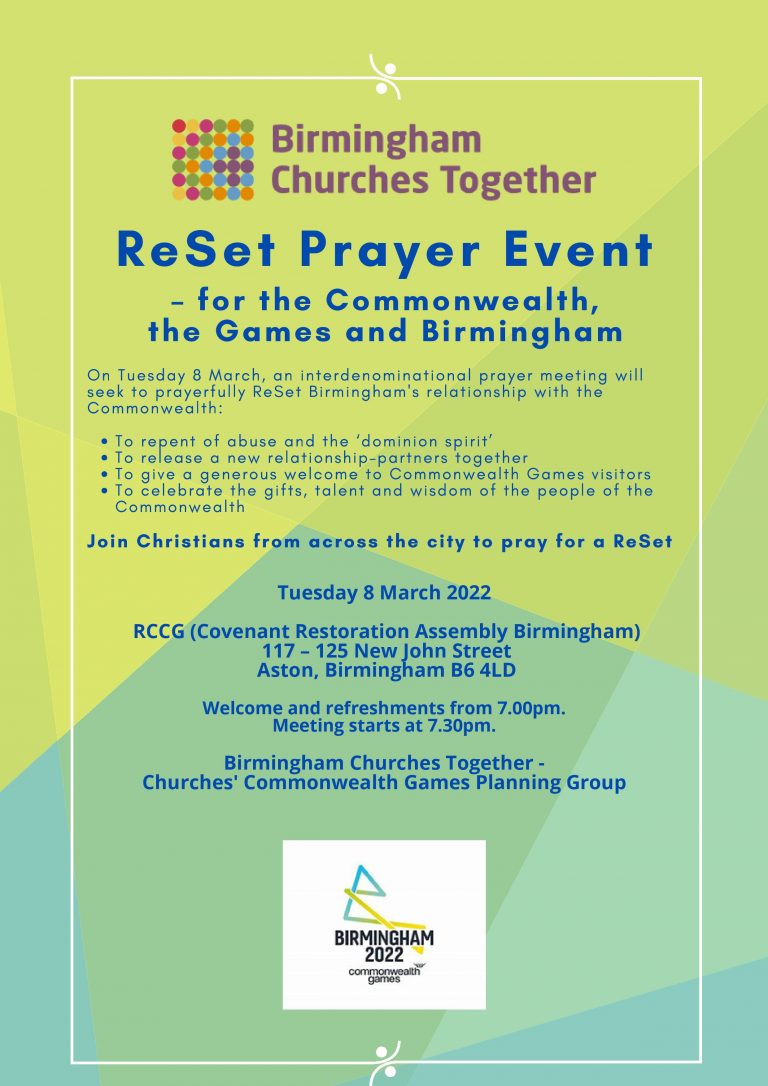 The Commonwealth of Nations is a voluntary association of 54 independent and equal countries in Africa, Asia, the Americas, Europe and the Pacific, not counting smaller territories and domains. It is home to one-third of the world’s population and includes both advanced economies and developing countries. The ReSet prayer meeting of 8 March is part of the ongoing preparations being undertaken by midlands Churches for the 2022 Commonwealth Games, which will take place in Birmingham, Coventry, Warwick, Smethwick and Wolverhampton between Thursday 28 July and Monday 8 August. For more information about those plans, click HERE.