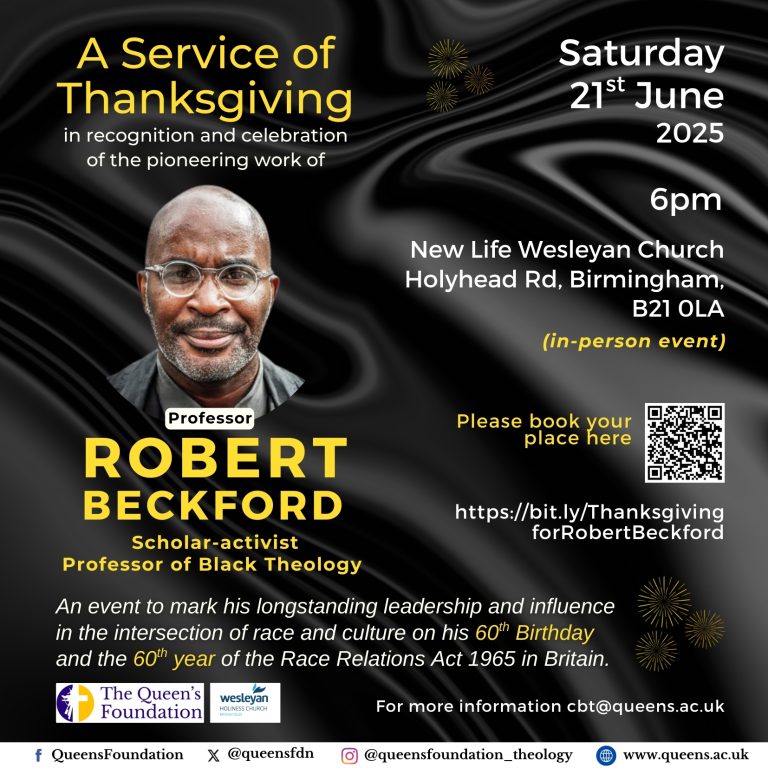 In partnership with the Queen’s Foundation for Ecumenical Theological Education, a Service of Thanksgiving in recognition of the pioneering work of Professor Robert Beckford will take place at 6.00pm on Saturday 21 June at the New Life Wesleyan Church, Holyhead Road, Handsworth, Birmingham, B21 0LA.