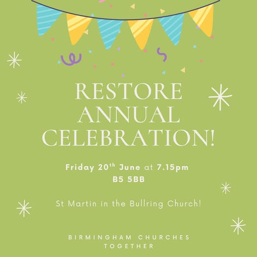 From 7.15pm at St Martin in the Bullring Church (B5 5BB). It will be a great time as we gather together to hear about the work of Restore, enjoy refreshments and meet new people!