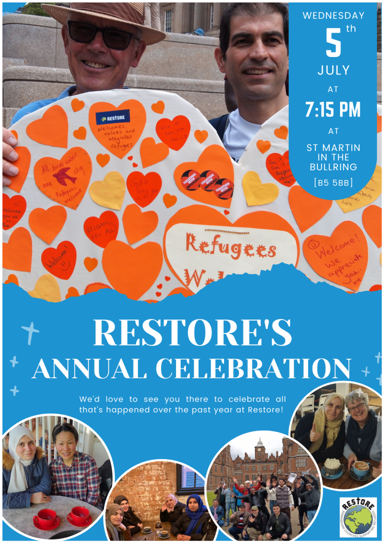 Restore, a project of Birmingham Churches Together will soon be holding its Annual Celebration. This is an opportunity to gather the Restore ‘family’ together to celebrate our work with refugees and asylum seekers over the past year. There will be input from volunteers, refugees and staff, music from refugees and the premiere of Restore’s new publicity film together with opportunities interaction particularly over refreshments at the end.