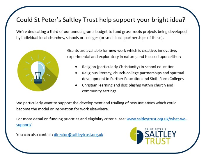 From April 2024, the St Peter’s Saltley Trust is to dedicate one third of its annual grants budget to funding grass-roots projects being developed by individual churches, schools or colleges (or small local partnerships of these). Grants are available for new work which is creative, innovative, experimental and exploratory in nature, and focused upon: