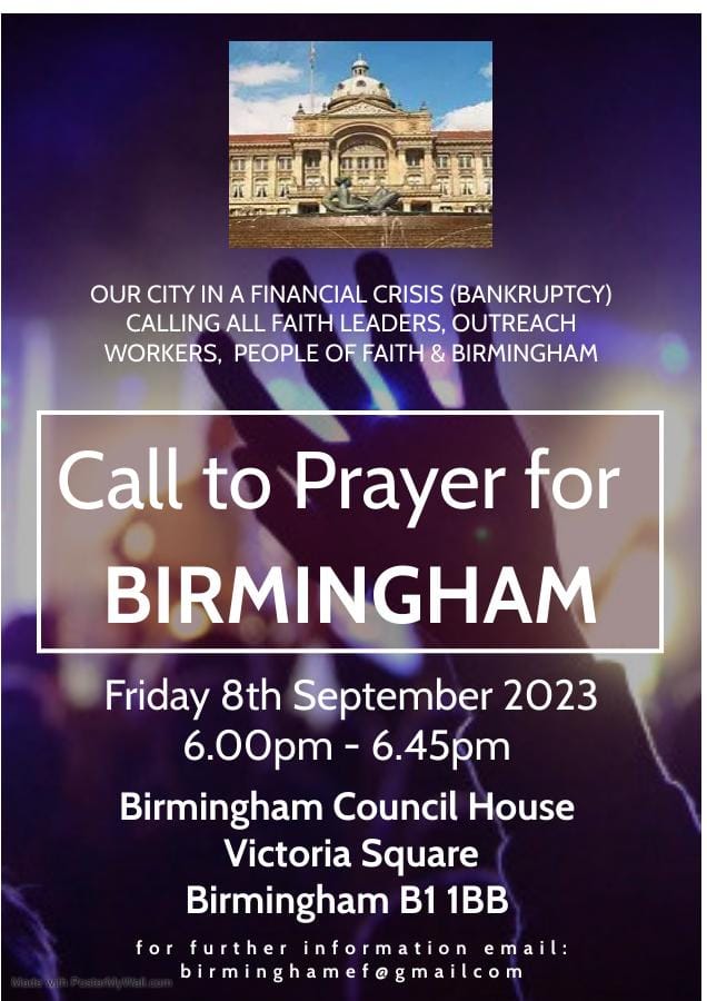 Gathering to Prayer for Birmingham Friday 8th September 2023 6.00pm Birmingham Council House Bishop Dr. Desmond Jaddoo MBE is arranging prayers this Friday following the news that Birmingham is in a state of bankruptcy. ‘It is time for us as people of faith to show leadership as we are the custodians of Birmingham. … Read more
