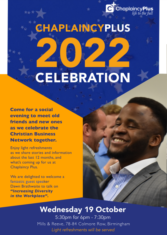 Tuesday 10th October, 6.00pm Mills & Reeve, 78-84 Colmore Row, Birmingham We are delighted to announce the date for our annual celebration, at which we will also be marking ChaplaincyPlus’ 20th birthday! This event will be great opportunity to catch up on recent developments, and to look forward to all that God has for us … Read more