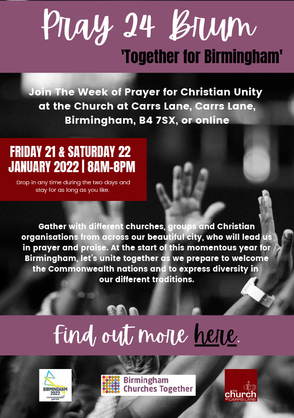 Maud Grainger from Birmingham Churches Together shares her reflections on #Pray24Brum Over the 19th and 20th of January, Christians came together to create a canopy of prayer over the city of Birmingham and beyond. Over 24 hours different traditions led an hour of prayer to those gathered in St Philip’s Cathedral and to those joining … Read more