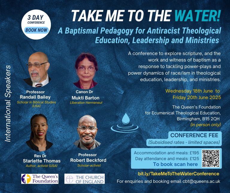 A three-day, in-person ‘Baptismal Pedagogy for Antiracist Theological Education, Leadership and Ministries’ will take place from Wednesday 18 to Friday 20 June inclusive at the Queen’s Foundation for Ecumenical Theological Education, Somerset Road, Birmingham, B15 2QH.