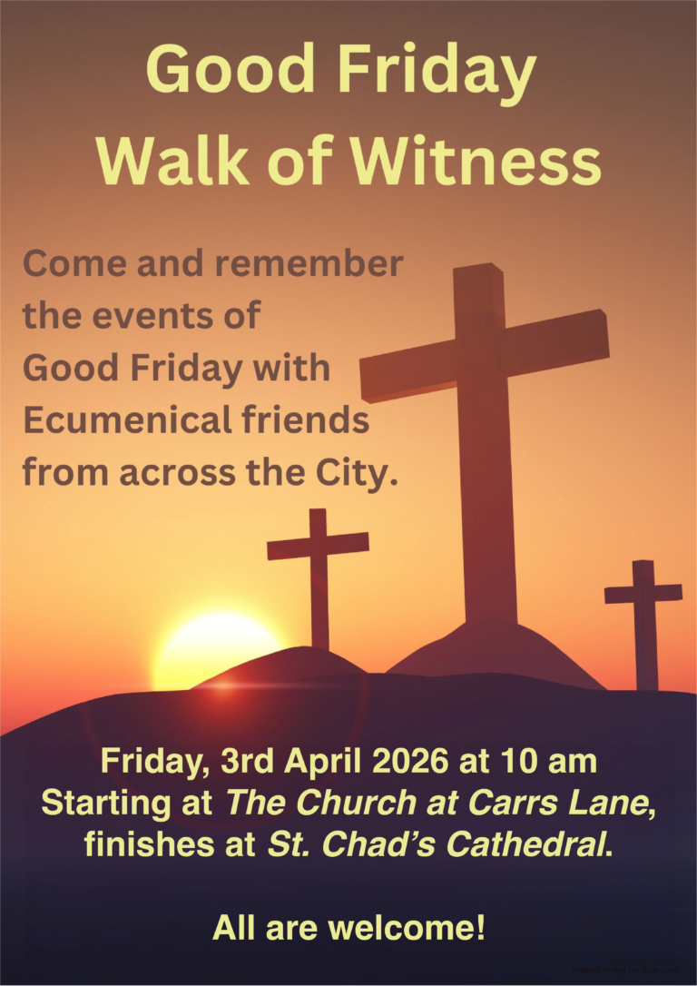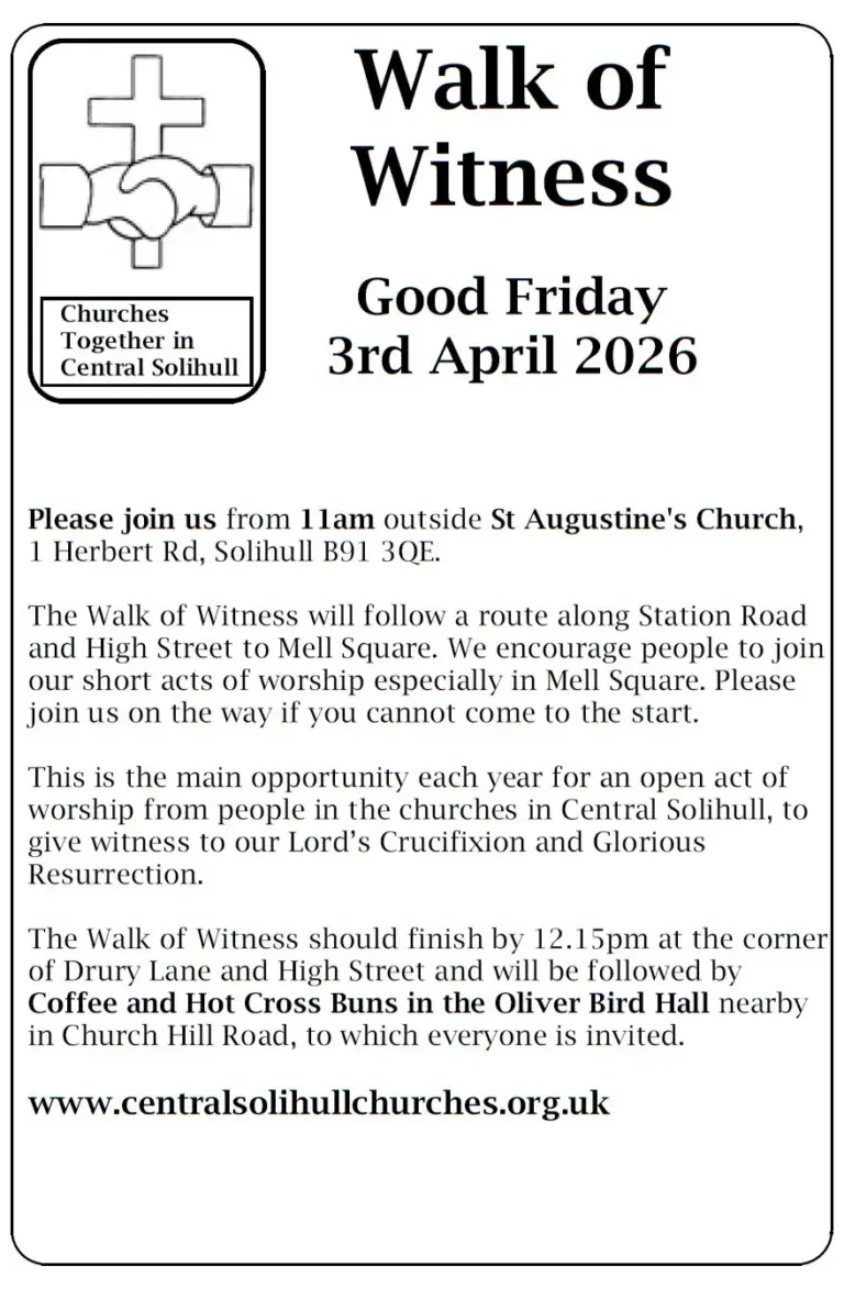 You are welcome to join us on Good Friday (3 April) for the Walk of Witness organised by Churches Together in Central Solihull.