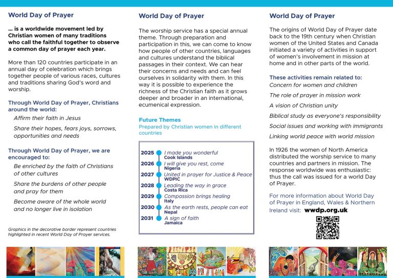 The 2025 World Day of Prayer will be held on Friday 7 March. A number of locations in Staffordshire will hold an ecumenical service on that day. Chosen by the Christian women of the Cook Islands, the 2025 theme is ‘I made you wonderful.’ Read more about the World Day of Prayer HERE.